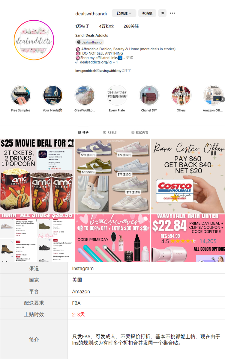 只发FBA,可发成人,不要提价打折,基本不挑都能上帖,现在由于Ins的规则改为有时多个折扣合并发同一个集合贴。带货能力一般,不建议多发