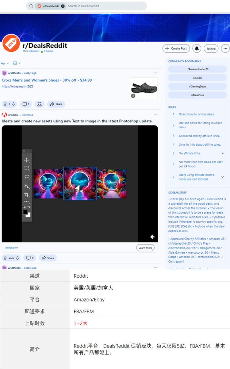 Reddit是知名的社交新闻论坛网站。被称为“互联网首页”,有23.4亿用户,月平均浏览量达80亿,是第七大浏览量最高的网站,编辑发帖,帖子发布在dealsreddit板块。 若出现差评,必须立即处理,否则编辑将直接删除该帖子。上帖门槛较低,提交后1~3天反馈。周末不收帖,若下单则顺延到下周(us)发布。发布后产品若出