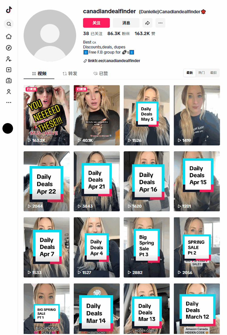 加拿大TK红人,粉丝85.9K,适合厨房、家居、母婴玩具等,全品类都可尝试,上贴率高。红人除了TK外,还会将deal分享到FB群。